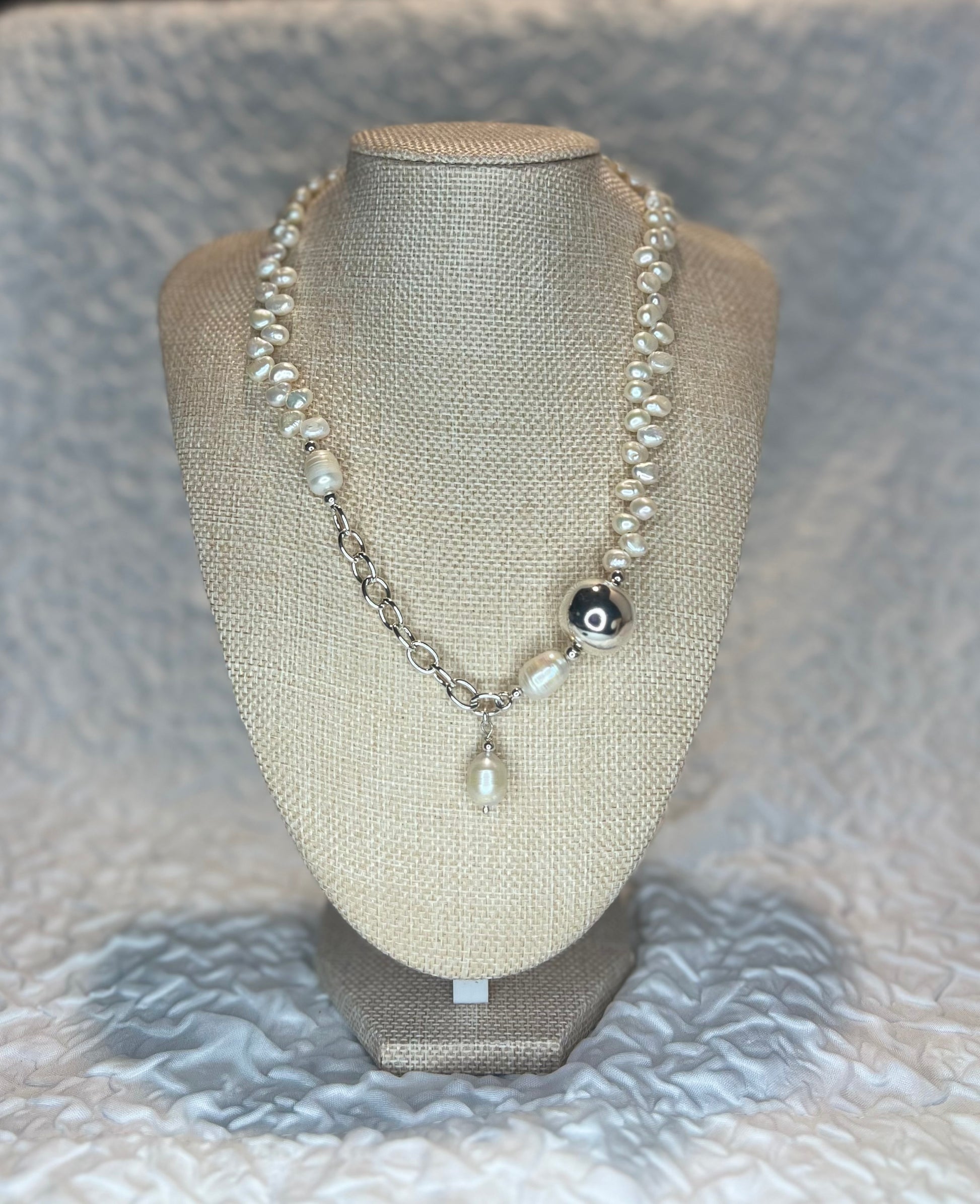 Elevate your accessory game with our stunning Ball & Pearl Necklace crafted from premium .925 silver and adorned with exquisite freshwater pearls. Measuring approximately 19.5 inches in length, this necklace is the perfect blend of elegance and contemporary design that will complement any outfit, from casual to formal.